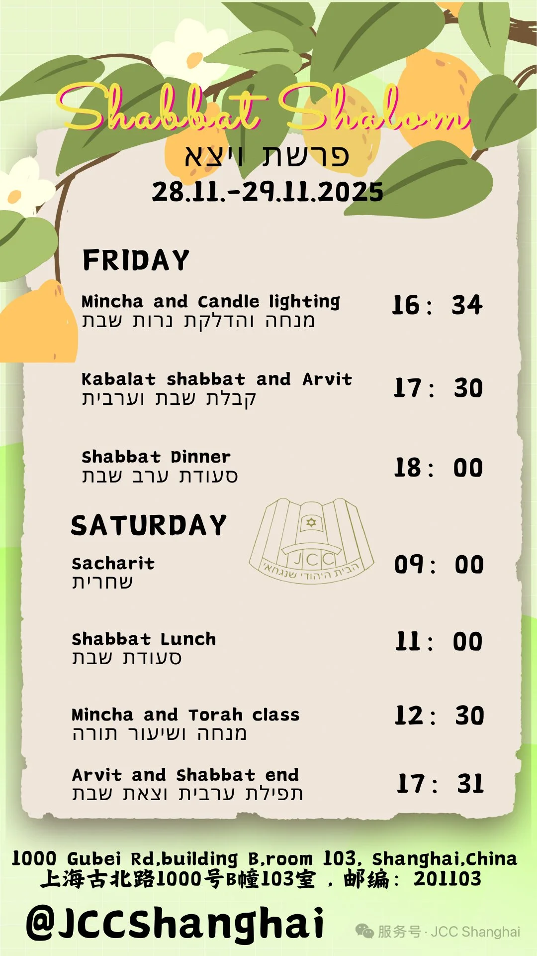 Join us for an unforgettable Shabbat experience filled with warmth, community, and sanctity! The Jewish Community in Shanghai invites you to enjoy delightful Shabbat meals, expertly prepared by a professional chef, featuring a diverse and carefully crafted kosher menu. Whether you're visiting for the Business or part of our local community, come celebrate Shabbat together, connect, and create lasting memories.